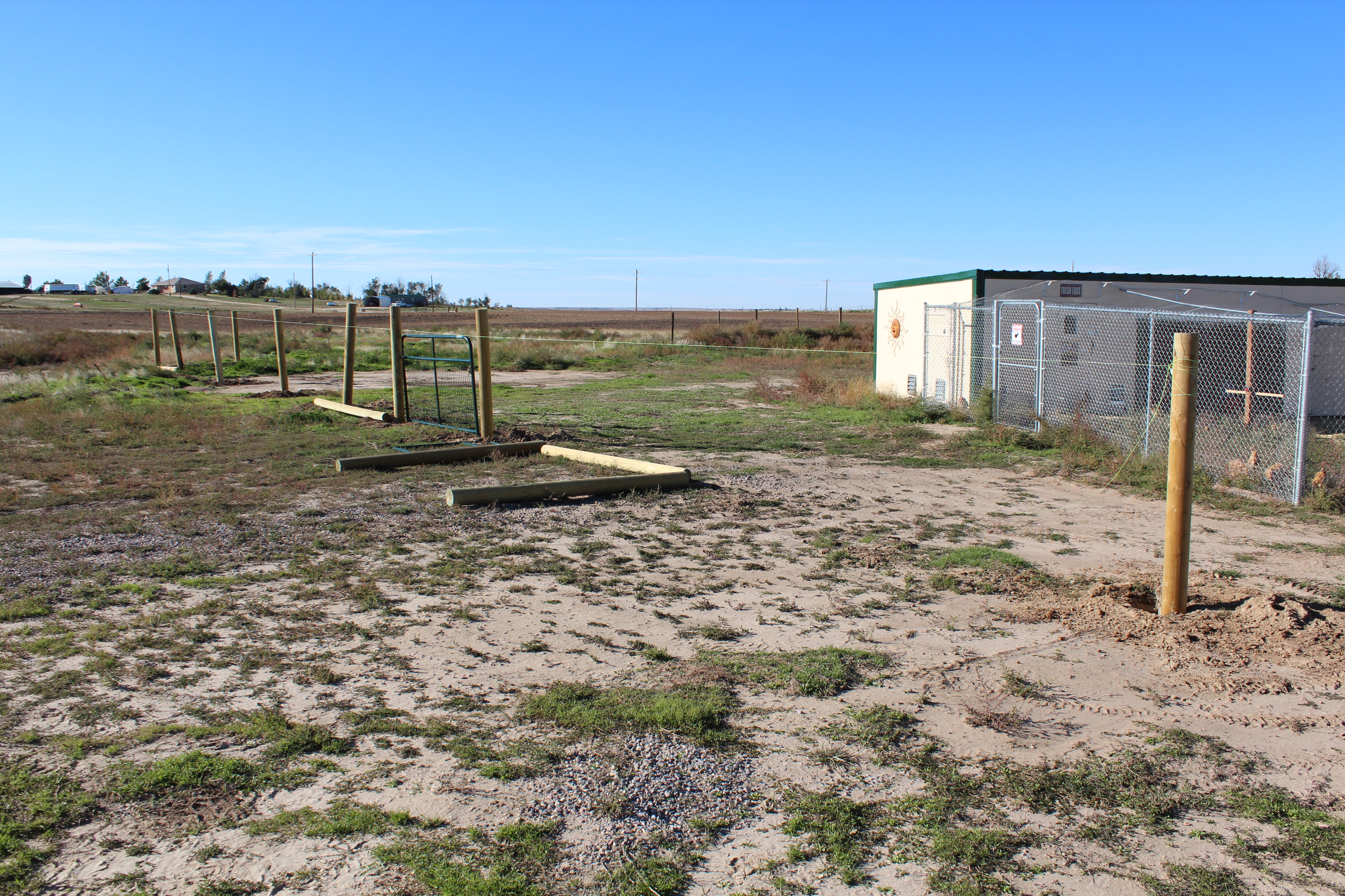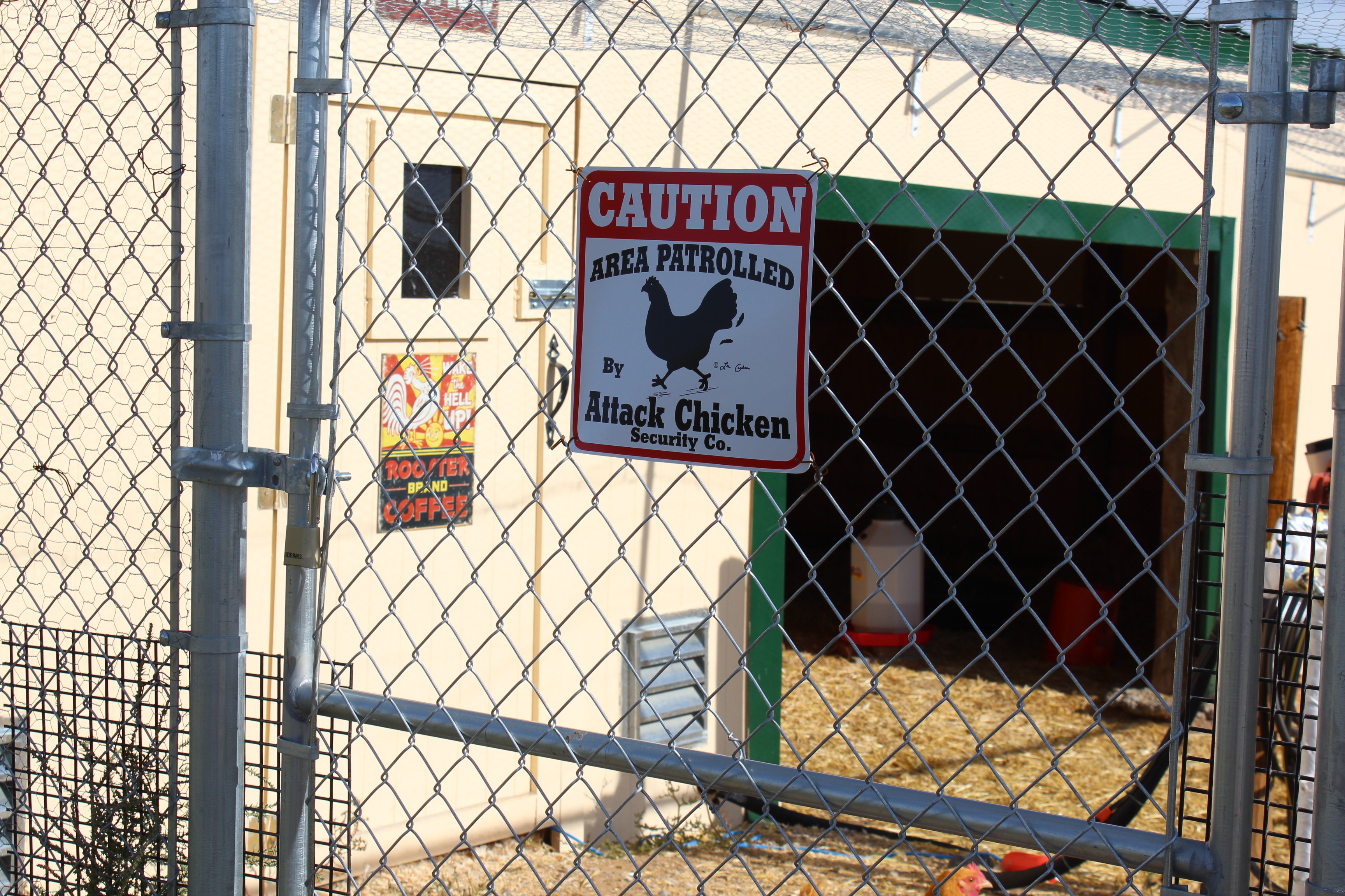 Here are some pictures of the beginning of the fencing project and a couple of cute signs we put up on the barn itself (The one below the window is hard to read. It says, “Rooster Brand Coffee” The rooster is exclaiming, “WAKE THE HELL UP!”) At least one of the roosters today was trying to get his cockadoodledo on. It was pretty humorous. It sounded like a teenager who’s voice is beginning to change. We will likely have roosters joining the chorus of roosters to the north and south of us very soon. Some people hate that sound, I think it is “wonderful”. The girls are all having their little skirmishes trying to establish their pecking order. They have also turned out to be BIG food wasters. I filled one feeder yesterday with about 25 lbs of feed and they had flicked most of it out onto the ground by the end of the day today. They call it “billing out”. They peck into the food and when they do, a bunch of it gets thrown out onto the ground. Oh well, I guess if they run out when I’m not here they can just scratch and peck it off of the barn floor!