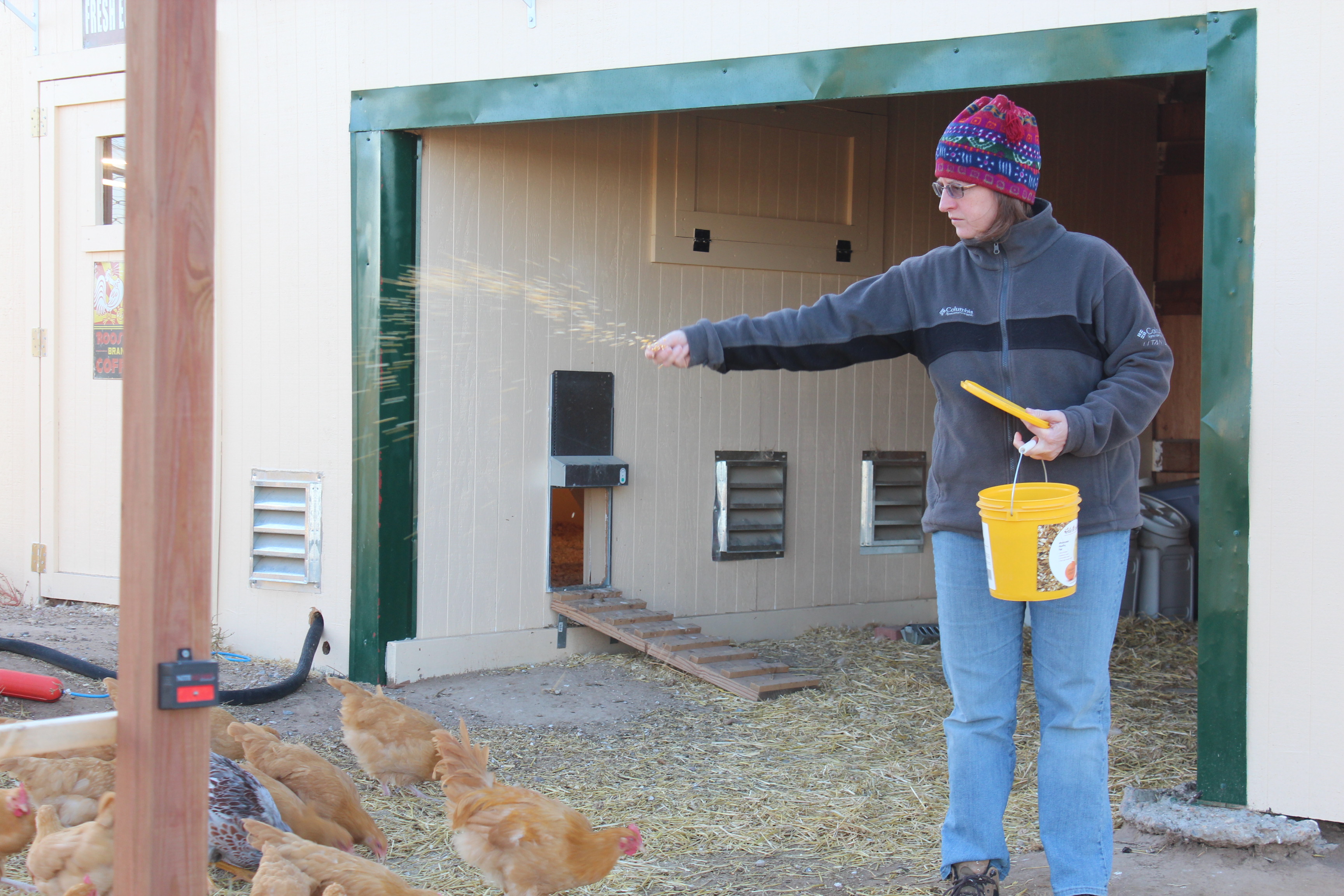 Beloved farm wife bundled up and feeding corn treats: