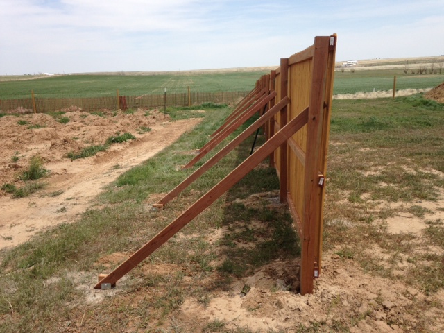 I dug 15, 15 inch deep holes across from the posts, installed steel anchors into concrete and strung 2×4’s at roughly 45 degrees to each post.  This has made the wall very rigid and I doubt now that it will meet with any problems (unless of course it is a tornado – eek.)  It was a full day today but the south side windbreak is completed.  There is still a pretty big one to make on the north but that is going to have to wait.