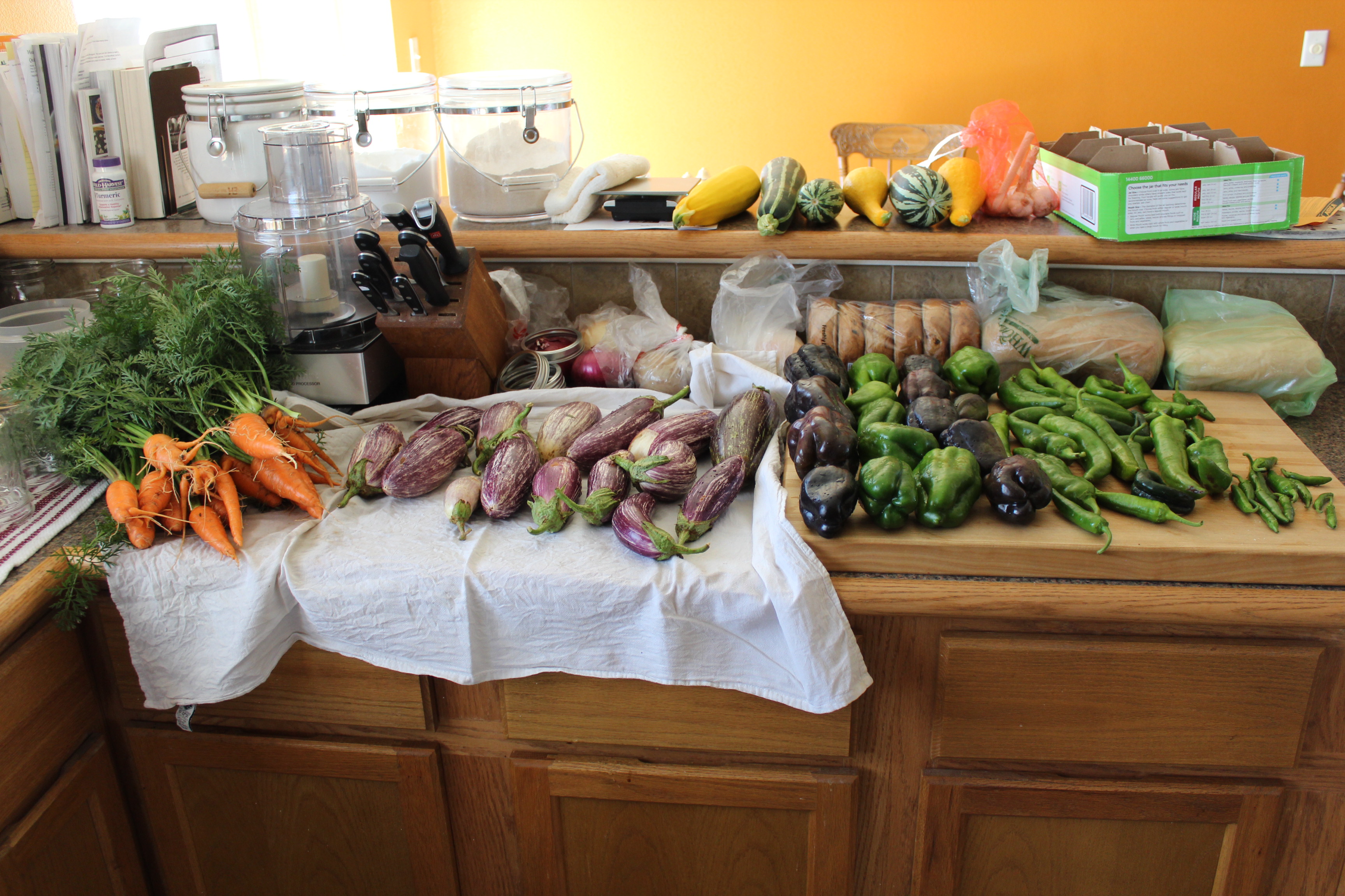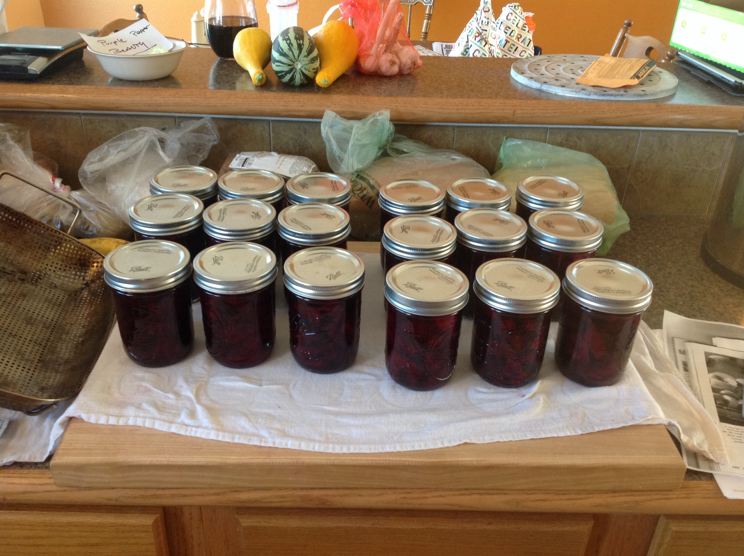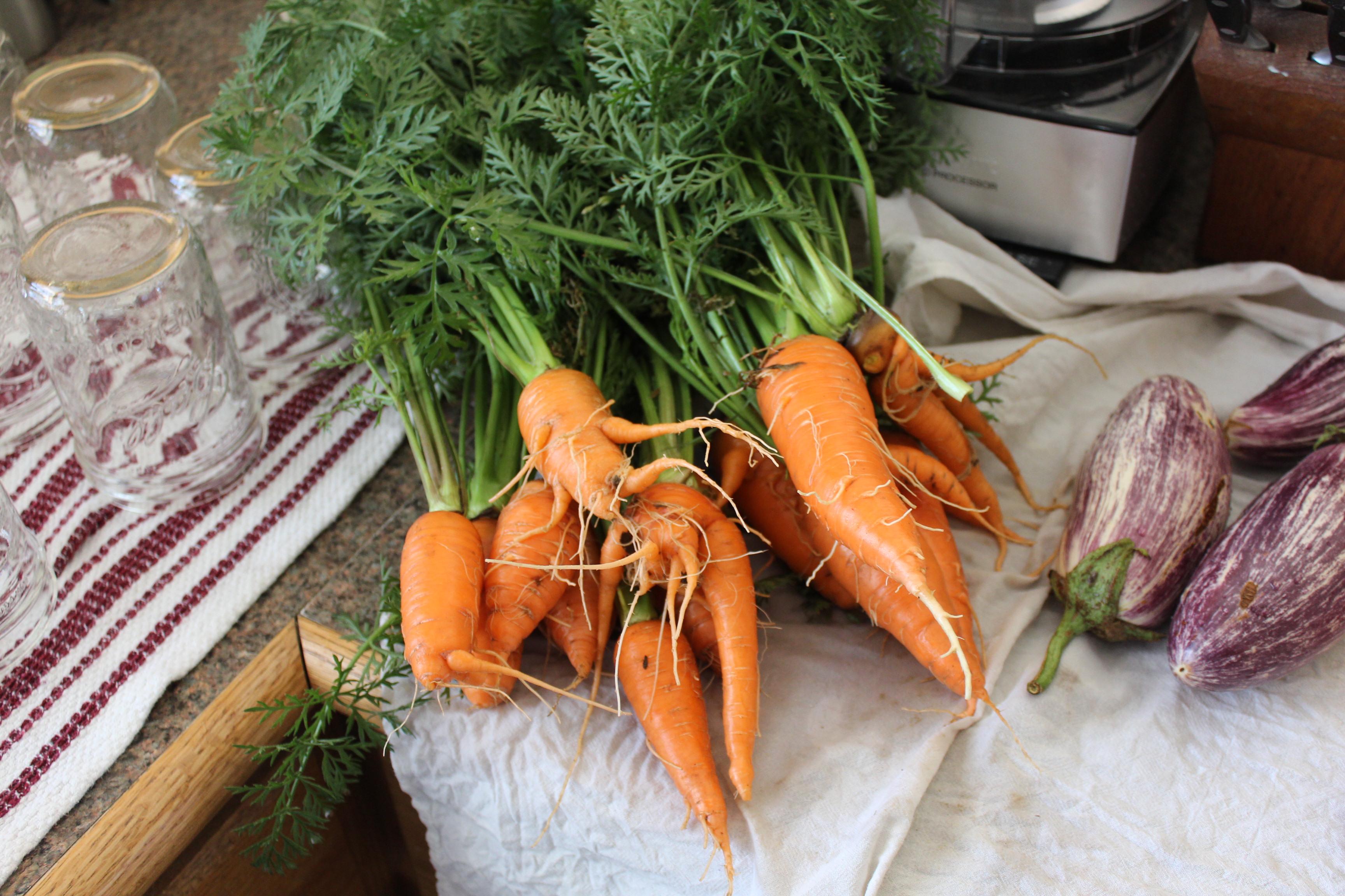 So we were up at dawn again today. Aaron’s new work schedule has really changed our internal clocks. He has to be at work at 6 am and that gets us all up around 4:30. Even on the weekend it feels like a luxury to wake up at 6! I went out to the garden around 7 and pulled up a couple of bushels of carrots and sprayed them off. Took them inside and began the task of canning them. There is nothing particularly difficult about canning except that you have to make sure to keep things clean, know what you are dealing with in terms of type of produce (acidity determines whether you can water bath them or have to use a pressure canner), and have a full day of uninterrupted time. The last batch of 20 pints of carrots began depressurizing around 2 o’clock this afternoon. For those of you who have been following along and want to know how to do this all you need is this book: