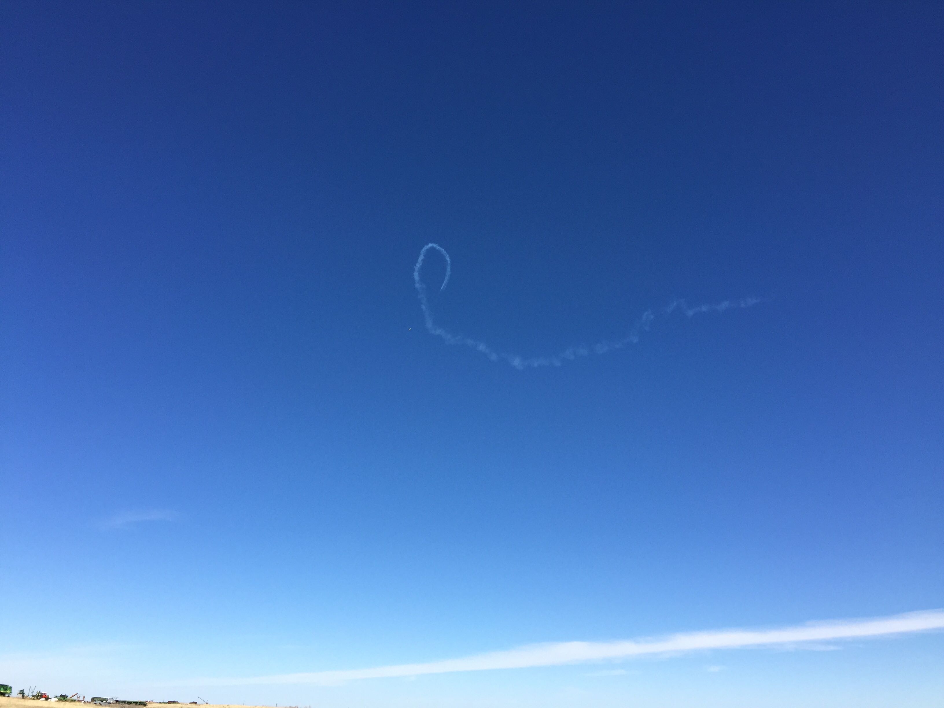 Sitting out on the deck last week I got entertained by a stunt plane. It flew over our back field and proceeded to do loops, stalls and rolls. I managed to get this shot as it had just come through a loop. If you look to the lower left following the smoke around you can make out the dot that is the plane itself.