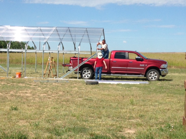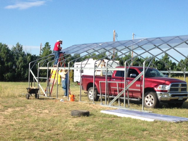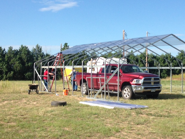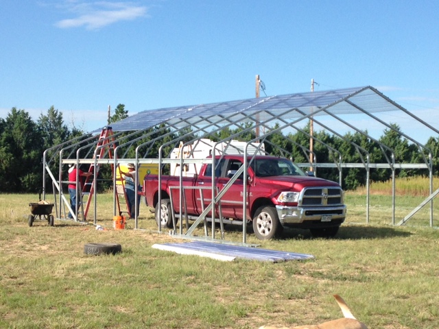 Yesterday we got the roof two thirds of the way on. Not a couple of hours later, Godzilla El Nino arrived with a vengeance and doesn’t look like it will go away in the next three days. Today, Sunday, it is currently sunny but muddy as all get out from the grid killing thunderstorms we had yesterday afternoon. We have pulled the truck under the new roof along with the tractor and put Zina’s car in the barn as we are expecting the possibility of tennis ball sized hail. Hopefully that is the exception to the rule, but the forecast from Denver to Des Moines is for raucous and nerve wracking thunderstorms. Best to be prepared. The pre-solar system, JAZ Farm off grid back up system, got put to the test last night. The oil lanterns and candles lit the house. The little generator was put to work keeping the freezers running and my marine battery/inverter gave us a little power for other things as well. All I know is that when the power is out one comes face to face with the reality of how many stupid electrical things we rely on. No one in our family today now doubts that the solar system with the battery backup is a bad idea.