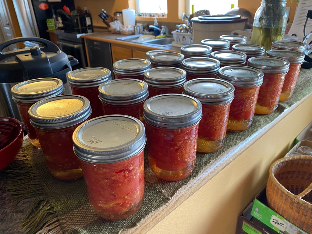 So mini-winter is but a memory. This week and next temperatures will all be up around 90 degrees with no moisture in sight. Working outside today was like working around a camp fire. There is yet another fire, this time up in Wyoming north of where I used to live. It is about 14,000 acres and it seems that a good chunk of the smoke made it’s way here. The air quality is quite bad and for we asthmatics, that limits outdoor time. But, while mini-winter was a very strange blip in the weather world, we are now back to getting the gardens harvested and processed at a more reasonable pace.