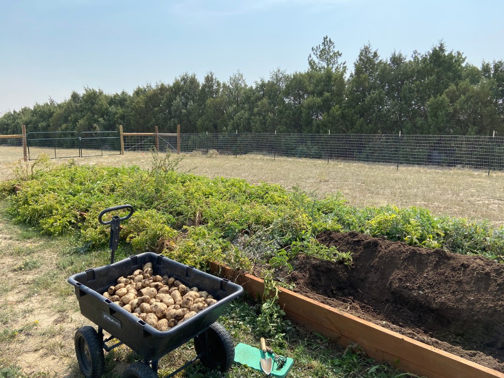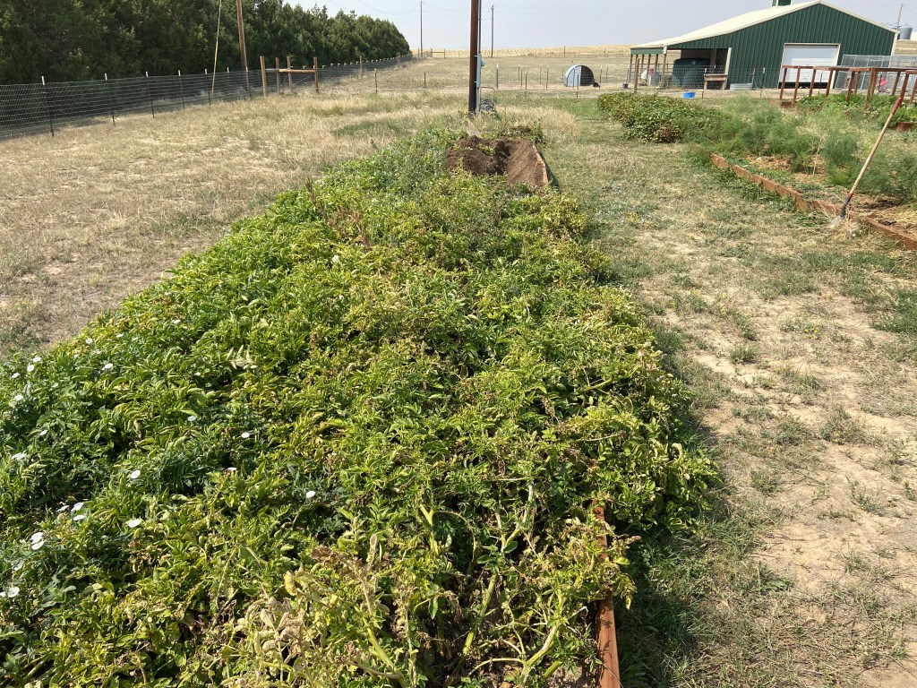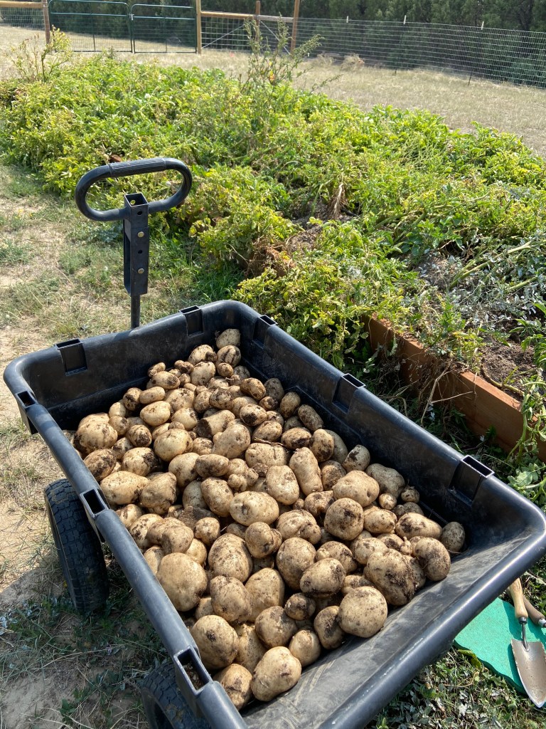 Probably the most back breaking task involved with gardening is harvesting potatoes. There is no real easy way to go about it, so down on your hands and knees you go trying to dig them up without skewering them in the process. This is not a perfect science, so any potato that got poked scraped or sliced will get canned or dehydrated as they don’t store well with wounds. Zina did the hand digging part and I followed behind her with a shovel to dig down deeper and seek out the stragglers. It worked out pretty well. The trench I dug needs to be done anyway in order to plant next spring. Once done we will line the ditch with peat moss and composted chicken manure and we will be ready to go in 2021. I have always ordered our seed stock; I am currently investigating the best way to store our own for next year as we might be facing the same over-demand for them that we had this year. Worse, I fear. Fortunately, our previous predictions about the yield are proving true. We have gotten through 1/4 of the planted rows and we are already over 100 lbs. This means we have recouped the seed potatoes by weight and are 50 lbs. to the good. The total should be in the ball park of 400 lbs. So if one is looking to stock a pantry, not only to make sure bellies stay filled, but to also have things that taste good, our main preserved staples should do the trick. We still have yet to check out the sweet potatoes, but I fear that that will be our lost crop due to the freak snow.